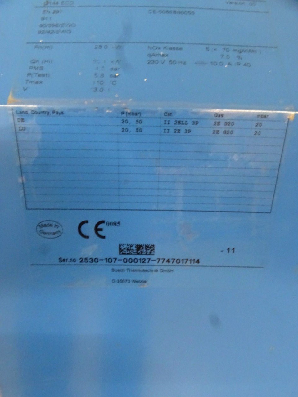 - Betriebsform: Gas / eingestellt auf Erdgas E (H), Umstellung auf Erdgas L (LL) oder Flüssiggas B (P) möglich
