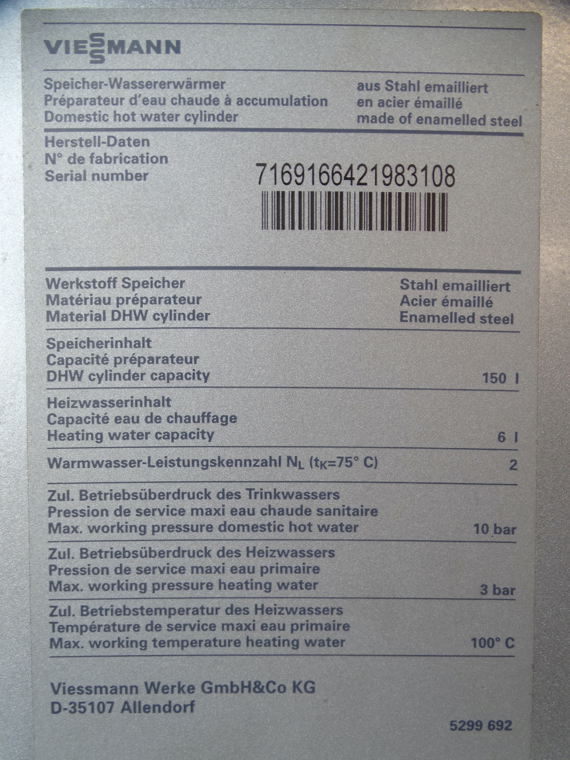 - zulässiger Betriebsüberdruck (Heizung): 3 bar